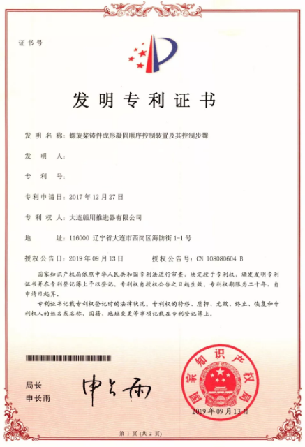 ????近日,大連船推申請(qǐng)的《螺旋槳鑄件成形凝固順序控制裝置及其控制步驟》發(fā)明專利通過(guò)國(guó)家知識(shí)產(chǎn)權(quán)局審查,獲得國(guó)家發(fā)明專利授權(quán)。