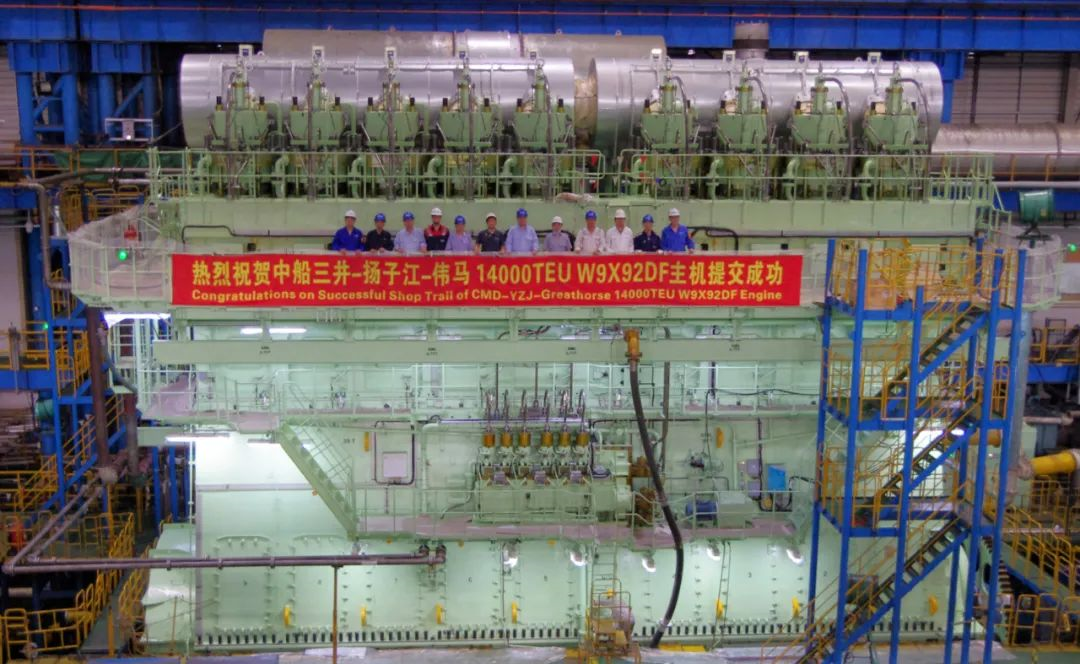 CMD-WinGD 9X92DF雙燃料主機(jī)最大功率42560kW,由中船動(dòng)力集團(tuán)下屬溫特圖爾發(fā)動(dòng)機(jī)有限公司研發(fā),上海中船三井造船柴油機(jī)有限公司生產(chǎn)制造將安裝在14000TEU集裝箱船上。