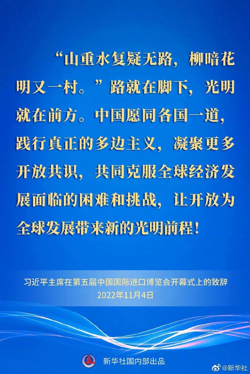 習(xí)近平最后強(qiáng)調(diào),路就在腳下,光明就在前方。中國(guó)愿同各國(guó)一道,踐行真正的多邊主義,凝聚更多開放共識(shí),共同克服全球經(jīng)濟(jì)發(fā)展面臨的困難和挑戰(zhàn),讓開放為全球發(fā)展帶來(lái)新的光明前程!