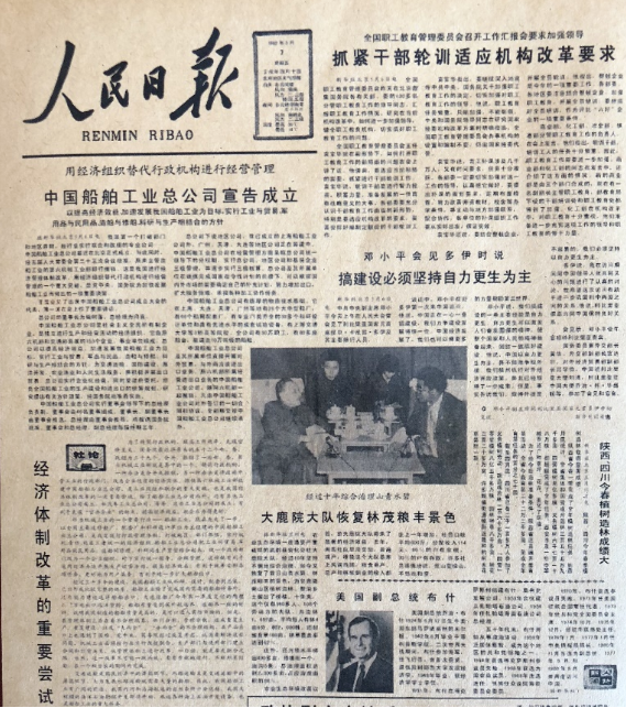 “改革開放是決定當(dāng)代中國命運的關(guān)鍵一招?!?982年5月7日《人民日報》頭版刊載文章:“用經(jīng)濟組織替代行政機構(gòu)進行經(jīng)營管理——中國船舶工業(yè)總公司宣布成立”,標題下文又著重強調(diào)“以提高經(jīng)濟效益,加速我國船舶工業(yè)為目標,實行工業(yè)與貿(mào)易,軍用品與民用品,造船與修船,科研與生產(chǎn)相結(jié)合的方針”。頭版還發(fā)表了以“經(jīng)濟體制改革的重要嘗試”為標題的“社論”。在這期《人民日報》的頭版還刊發(fā)了鄧小平同志接待外賓時的講話“搞建設(shè),必須堅持自力更生為主”。