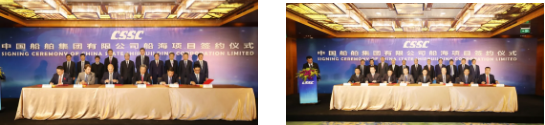 ????主要簽約項(xiàng)目包括:中國(guó)船舶集團(tuán)所屬重慶川東船舶重工有限責(zé)任公司與中遠(yuǎn)海運(yùn)(上海)有限公司1.38萬(wàn)噸不銹鋼化學(xué)品船項(xiàng)目;中國(guó)船舶集團(tuán)所屬大連船舶重工集團(tuán)有限公司與招商輪船VLCC項(xiàng)目;中國(guó)船舶集團(tuán)所屬上海外高橋造船有限公司與工銀租賃21萬(wàn)噸散貨船項(xiàng)目、外高橋造船與EPS公司20.9萬(wàn)噸雙燃料散貨船項(xiàng)目;中國(guó)船舶集團(tuán)所屬江南造船(集團(tuán))有限責(zé)任公司與太平洋氣體公司VLEC項(xiàng)目、江南造船與 SINOGAS86000立方米VLGC項(xiàng)目、江南造船與UECC公司3600車汽車滾裝船項(xiàng)目、江南造船與派格達(dá)克公司22000方乙烯船項(xiàng)目;中國(guó)船舶集團(tuán)所屬?gòu)V船國(guó)際有限公司與斯坦納公司5萬(wàn)噸甲醇雙燃料油船項(xiàng)目、廣船國(guó)際與EPS公司LNG雙燃料蘇伊士油船項(xiàng)目、中國(guó)船舶集團(tuán)所屬滬東中華造船(集團(tuán))有限公司與MOL18600立方LNG加注船項(xiàng)目;中國(guó)船舶集團(tuán)所屬武船集團(tuán)青島北海船舶重工有限責(zé)任公司與中國(guó)船舶集團(tuán)所屬中船租賃21萬(wàn)噸散貨船項(xiàng)目、中國(guó)船舶集團(tuán)所屬中船澄西船舶修造有限公司與國(guó)銀租賃85000噸散貨船項(xiàng)目、重慶川東船舶重工與重慶冠達(dá)世紀(jì)游輪650客游輪項(xiàng)目;中國(guó)船舶租賃與 Golar LNG 船舶改裝融資租賃項(xiàng)目、中國(guó)船舶租賃與SINOGAS86000立方米VLGC融資租賃項(xiàng)目;中船租賃與山東海運(yùn)21萬(wàn)噸散貨船融資租賃項(xiàng)目、中船租賃與Navig 8 成品油船聯(lián)合投資協(xié)議、中船租賃與新加坡星展銀行VLCC融資協(xié)議。