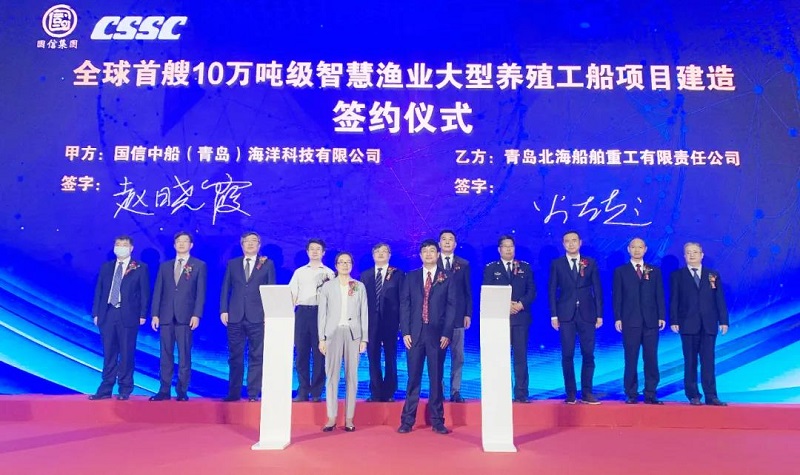 ????6月3日,中國船舶集團有限公司旗下武船集團青島北海船舶重工有限責(zé)任公司與國信中船(青島)海洋科技有限公司在青島西海新區(qū)正式簽署全球首艘10萬噸級智慧漁業(yè)大型養(yǎng)殖工船的建造合同。本次簽約標(biāo)志著養(yǎng)殖工船項目正式進(jìn)入實質(zhì)性建造階段,該船將于2022年3月交付。中國船舶集團黨組成員、副總經(jīng)理孫偉,青島市副市長耿濤等領(lǐng)導(dǎo)和嘉賓出席簽約儀式。