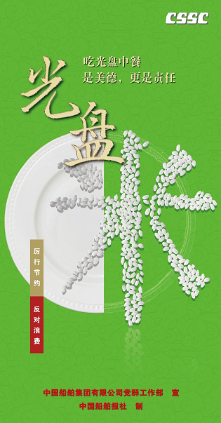 為認真貫徹落實習近平總書記關于制止餐飲浪費行為的重要指示精神,大力弘揚中華民族勤儉節(jié)約、珍惜糧食的文明用餐習慣,中國船舶集團積極開展“制止餐飲浪費 踐行光盤行動”專項宣傳引導活動。