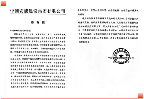 近日,擔(dān)負(fù)國(guó)家應(yīng)急救援職責(zé)使命的中國(guó)安能建設(shè)集團(tuán)有限公司發(fā)來一封感謝信。