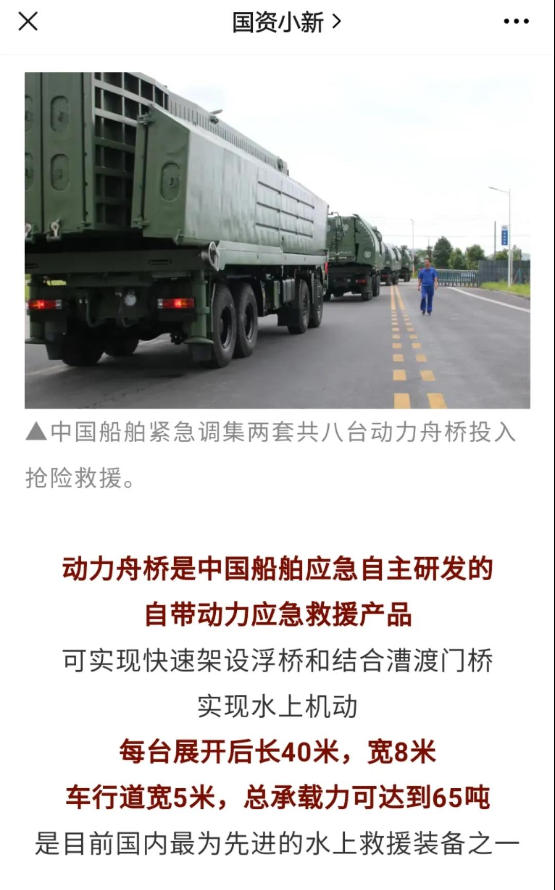 在本次搶險(xiǎn)救援任務(wù)中,中船應(yīng)急制造的應(yīng)急動(dòng)力舟橋被稱作“救援航母”,先后被多家媒體報(bào)道多次霸屏。
