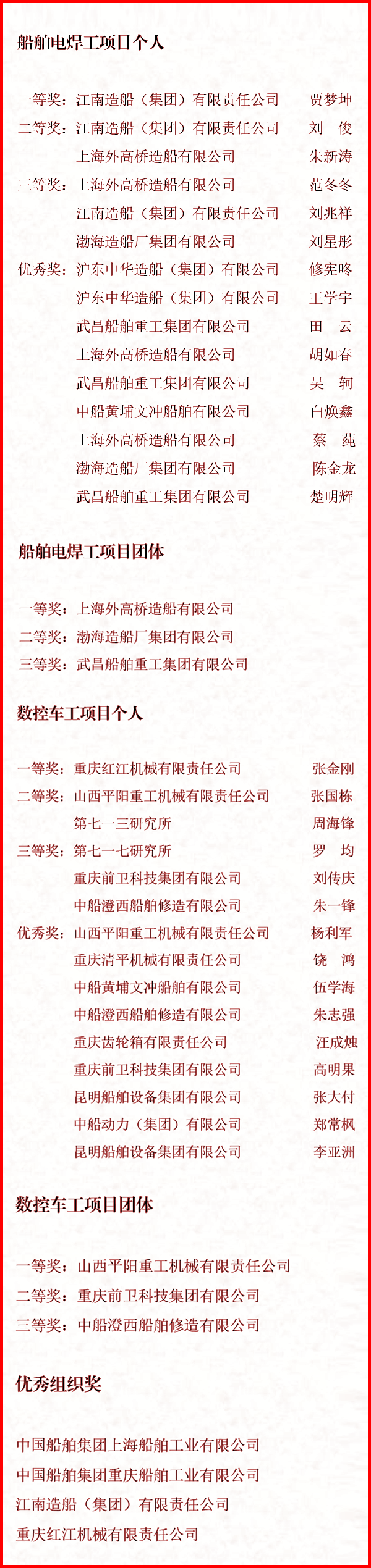 9月27日至9月30日,中國船舶集團(tuán)有限公司聯(lián)合中國就業(yè)培訓(xùn)技術(shù)指導(dǎo)中心,在上海、重慶兩地成功舉辦了國家二類競賽——“2021年全國行業(yè)職業(yè)技能競賽—中國船舶集團(tuán)有限公司職業(yè)技能競賽”。來自49家成員單位共計(jì)128名選手同臺角逐,最終評選出個(gè)人及團(tuán)體一、二、三等獎(jiǎng)和個(gè)人優(yōu)秀獎(jiǎng),優(yōu)秀組織獎(jiǎng)等獎(jiǎng)項(xiàng)。