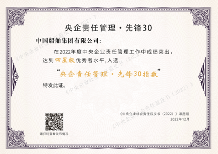 2022年12月20日,由國務(wù)院國資委社會(huì)責(zé)任局主辦、中國社會(huì)責(zé)任百人論壇承辦的“新征程 新責(zé)任——《中央企業(yè)社會(huì)責(zé)任藍(lán)皮書(2022)》《國資國企社會(huì)責(zé)任藍(lán)皮書(2022)》發(fā)布活動(dòng)”在京舉行。活動(dòng)以“云端會(huì)議”的方式舉辦,發(fā)布了“央企責(zé)任管理 · 先鋒30指數(shù)”,中國船舶集團(tuán)入選該指數(shù)。