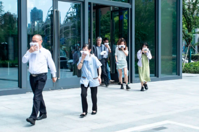 本次演練模擬總部1#樓電梯間、2#7層會議室發(fā)生火災(zāi),物業(yè)人員先后用滅火器、樓層消防水系統(tǒng)實(shí)施初期火災(zāi)撲救,火勢無法控制后立即拉響疏散警報(bào),同時(shí)向最近的消防站請求支援。全體人員按照疏散路線緊急有序完成了疏散。