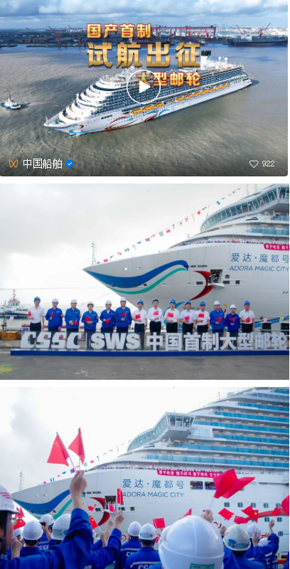 “我宣布,中國(guó)首制大型郵輪試航出征!”