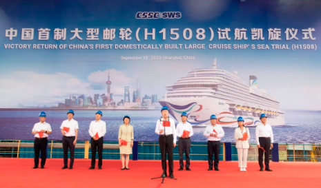 現(xiàn)場(chǎng)舉行了簡(jiǎn)短的歡迎儀式。溫剛宣布中國(guó)首制大型郵輪完工試航所有驗(yàn)證項(xiàng)目全部達(dá)標(biāo),試航任務(wù)圓滿完成。