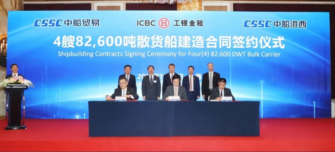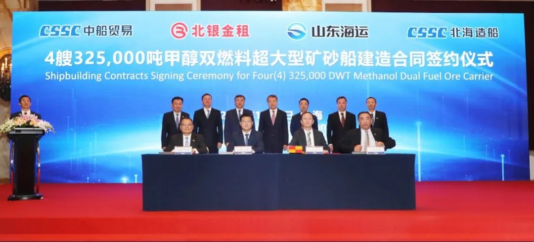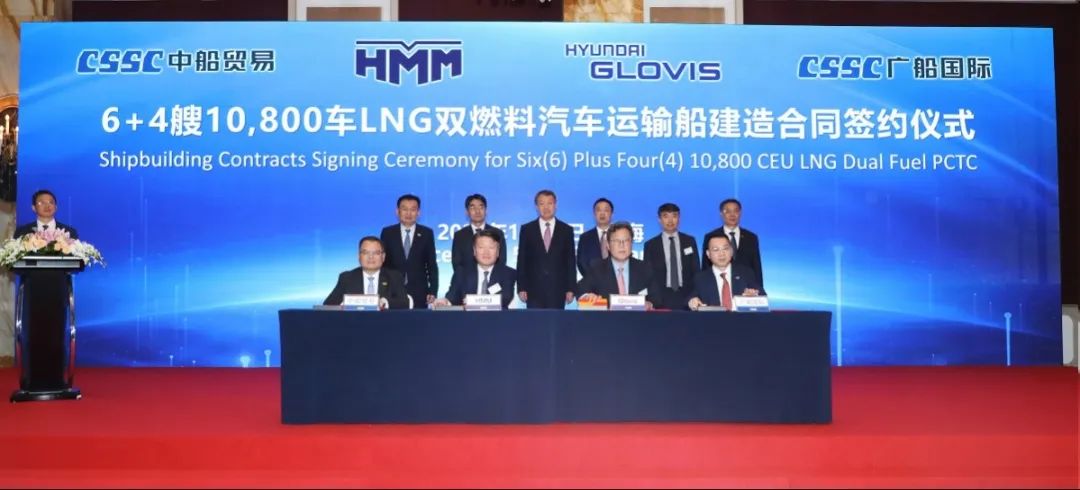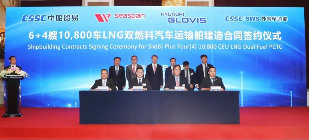 簽約儀式上,外高橋造船、中船貿(mào)易與Seaspan、現(xiàn)代Glovis簽署了6+4艘10800車LNG雙燃料PCTC船項目;廣船國際、中船貿(mào)易與HMM、現(xiàn)代Glovis簽署了6+4艘10800車LNG雙燃料PCTC船項目;北海造船、中船貿(mào)易與北銀金租、山東海運簽署了4艘325000噸超?型甲醇雙燃料礦砂船項目;江南造船、中船貿(mào)易與太平洋氣體簽署了3艘99000方VLEC船項目;黃埔文沖、中船貿(mào)易與Benelux公司簽署了2+1艘48000方LPG船項目;中船澄西、中船貿(mào)易與工銀金租簽署了4艘82600噸散貨船項目;大連造船與七二五所青島雙瑞簽署了15000TEU集裝箱船甲醇供應系統(tǒng)項目。