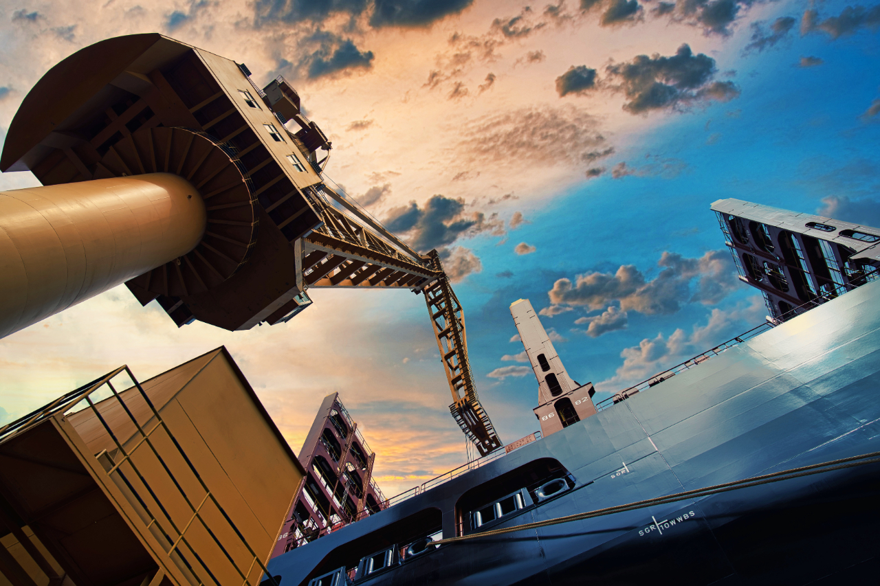 夕陽(yáng)下觀看遠(yuǎn)景的船廠,另有一番意境。