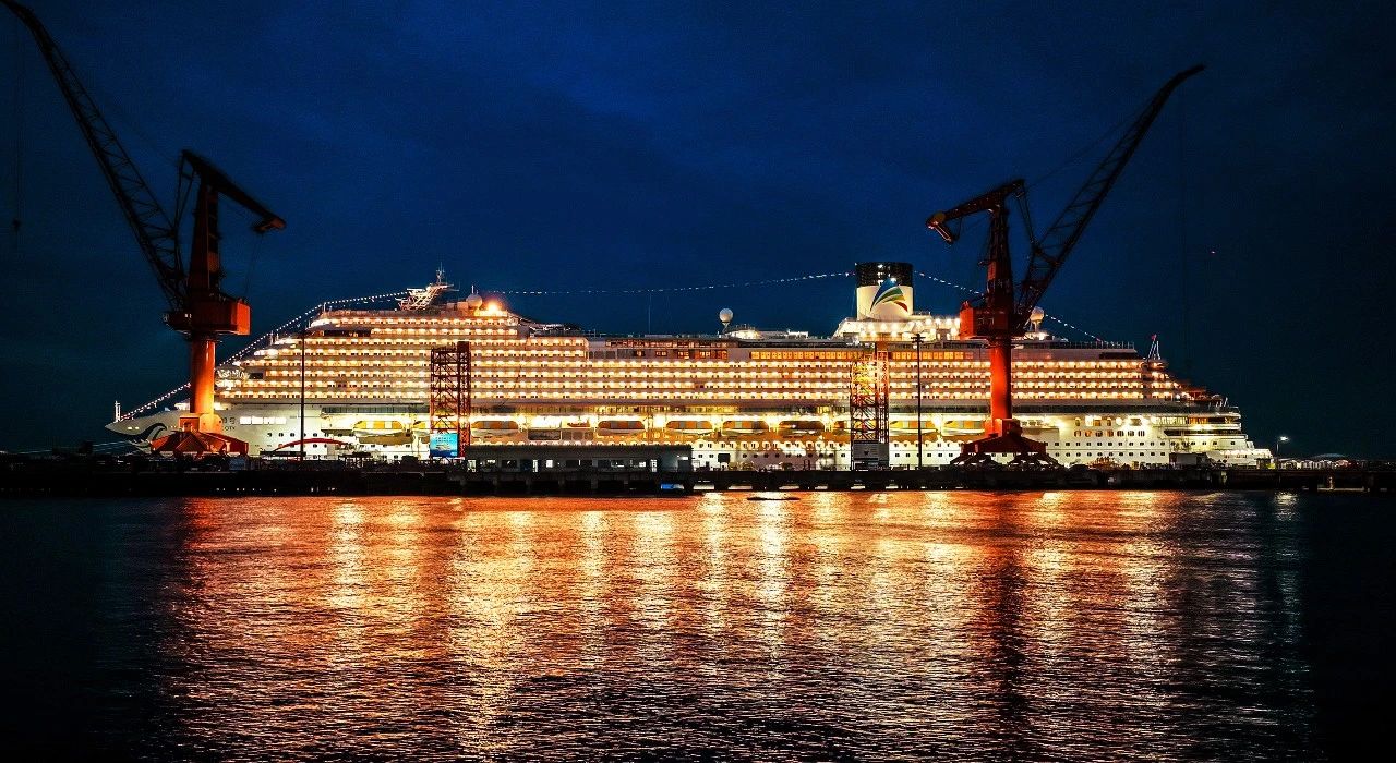 國(guó)產(chǎn)首艘國(guó)產(chǎn)大型郵輪“愛(ài)達(dá)·魔都號(hào)”,??吭陂L(zhǎng)江口,燈光電路測(cè)試期間,華燈綻放恍如白晝。