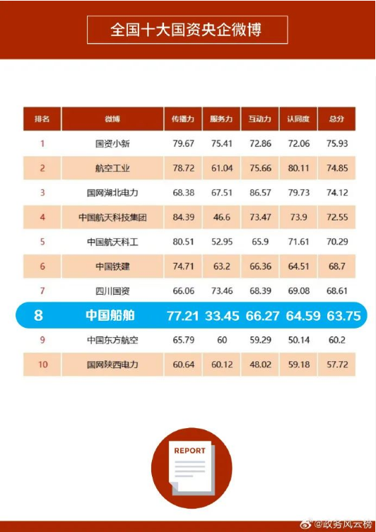 1月31日,由微博出品,人民網(wǎng)輿情數(shù)據(jù)中心、人民網(wǎng)數(shù)據(jù)研究院提供學(xué)術(shù)支持的“2023年度政務(wù)微博影響力報告”發(fā)布?!爸袊啊蔽⒉┑巧稀叭珖髧Y央企微博”榜單,這是“中國船舶”微博第三次進入“全國十大國資央企微博”排行榜。