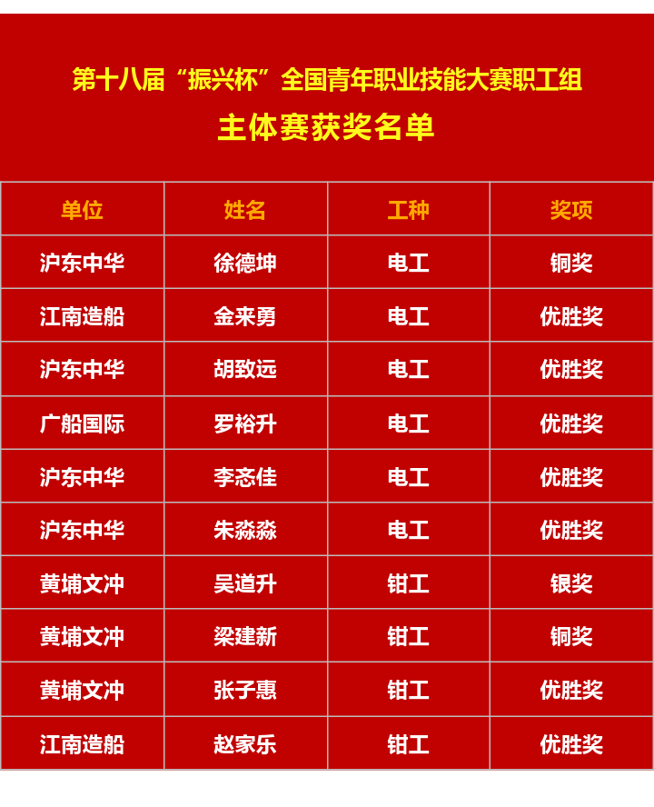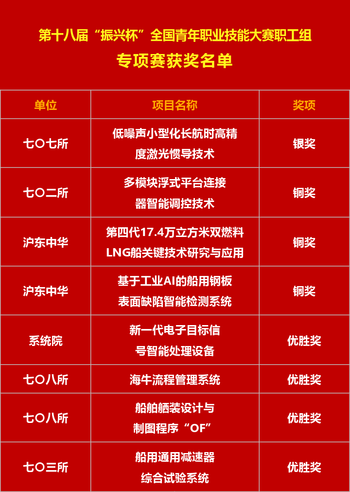11月15日,第十八屆“振興杯”全國青年職業(yè)技能大賽職工組全國決賽在沈陽落下帷幕,中國船舶集團青年取得主體賽(職業(yè)技能競賽)“1銀2銅7優(yōu)勝獎”、專項賽(創(chuàng)新創(chuàng)效競賽)“1銀3銅4優(yōu)勝獎”的好成績。其中,黃埔文沖吳道升、七〇七所“低噪聲小型化長航時高精度激光慣導技術(shù)”項目分獲銀獎,在“青春競技場”上展現(xiàn)了船舶青年的自信卓越風采。