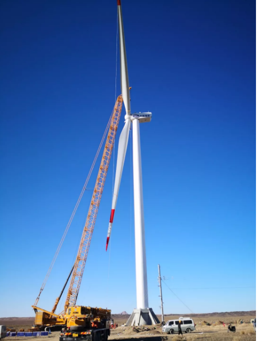 ????近日,中國海裝鑫垣新疆昌吉奇臺北塔山99兆瓦風(fēng)電項(xiàng)目首臺H136-2.2兆瓦機(jī)組完成吊裝。