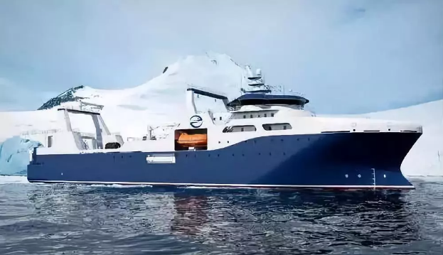 ????“深藍號”由黃埔文沖建造,七〇八所參與設計,總長約120米,型寬21.6米,設計吃水7.3米,設計航速15節(jié),主機功率8000 千瓦,載重噸約5000噸?!吧钏{號”是我國自主研制建造的第一艘漁業(yè)捕撈加工一體船,也是目前最大最先進的漁業(yè)捕撈加工一體船,取得近200項知識產(chǎn)權保護,實現(xiàn)了我國現(xiàn)代化漁業(yè)船舶裝備領域的重大突破,達到世界先進水平;主要用于南大洋漁業(yè)捕撈,兼顧海洋科考功能,可滿足ICE-A冰區(qū)(冰厚度0.8米)及-25℃低溫環(huán)境的營運要求。