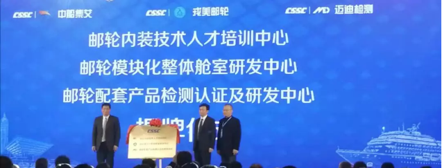 ????為解決我國郵輪配套產品認證難、艙室系統(tǒng)技術水平落后、專業(yè)人才匱乏等問題,在中船郵輪和中國船舶集團所屬中船九江海洋裝備(集團)有限公司的指導下,中國船舶集團所屬中船集艾郵輪科技發(fā)展(上海)有限公司聯(lián)合中國船級社和上海工程技術大學成立了《郵輪配套產品測試認證及研發(fā)中心》、《郵輪模塊化整體艙室研發(fā)中心》和《郵輪內裝技術人才培訓中心》,并在會上正式揭牌。