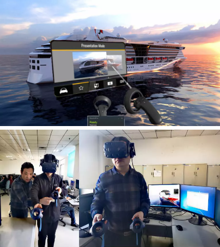????該平臺通過總體總師與三維造型師的協(xié)同交互,完成全船三維設計(全船造型和艙室內部裝飾等)并搭建逼真場景,用戶通過穿戴智能頭顯,操縱控制手柄,真正實現(xiàn)了“漫步甲板、穿行船艙”的自主漫游體驗。