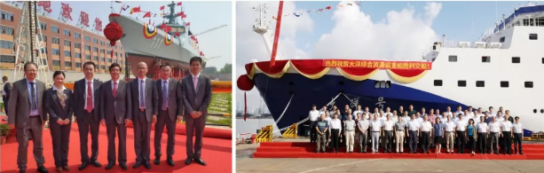 以上左圖:馬來西亞瀕海任務艦首艦“KERIS”號下水;右圖:“大洋號”綜合資源調查船交船儀式。