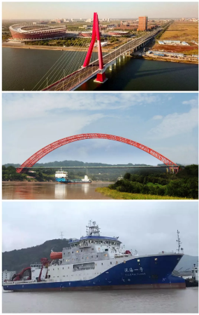 ????上圖所示均為武船集團(tuán)承建的項(xiàng)目。圖1:遼寧盤錦遼濱沿海經(jīng)濟(jì)開發(fā)區(qū)大橋;圖2:四川合江長(zhǎng)江一橋;圖3:我國(guó)自主研制的第一艘載人潛水器支持母船“深海一號(hào)”。