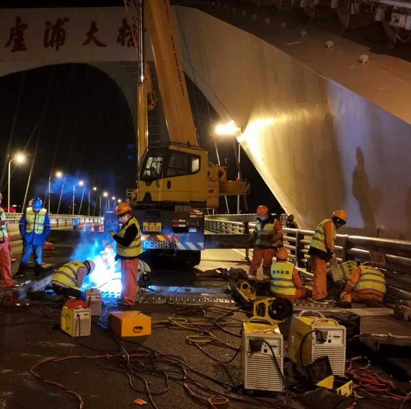 ????此時(shí),來(lái)自中國(guó)船舶集團(tuán)所屬上海盧浦大橋投資發(fā)展有限公司的守橋人開工了。近20平方米的施工區(qū)域,人頭攢動(dòng)、焊花飛舞,工人身著的安全背心泛出的熒光,焊槍下閃爍的弧光和橋面的燈光交相輝映。