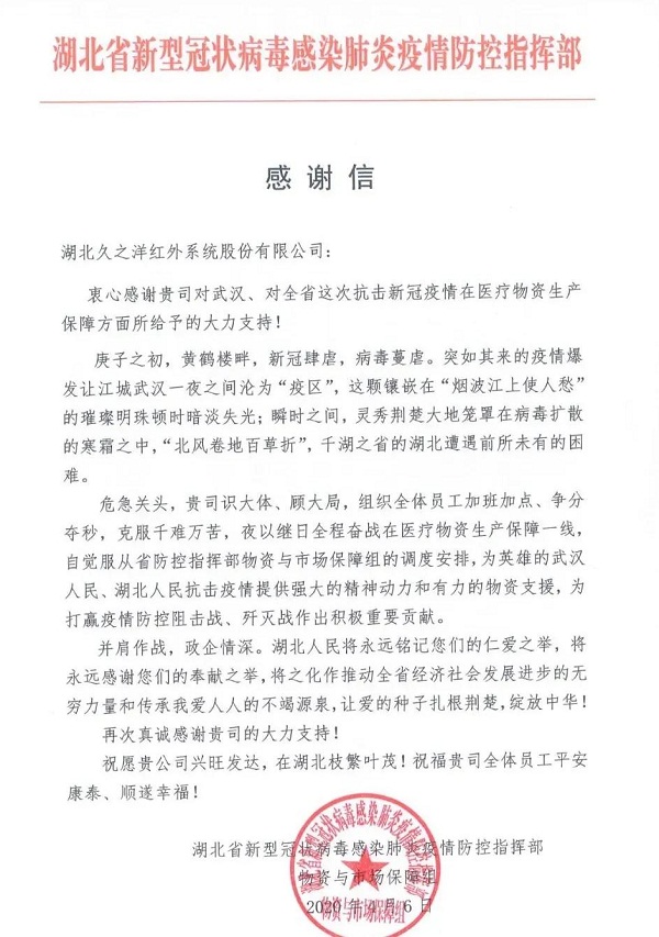 ????信中,對中國船舶集團七一七所所屬湖北久之洋紅外系統(tǒng)股份有限公司在抗擊新冠肺炎疫情工作中,在醫(yī)療物資生產保障方面給予的大力支持表示感謝。