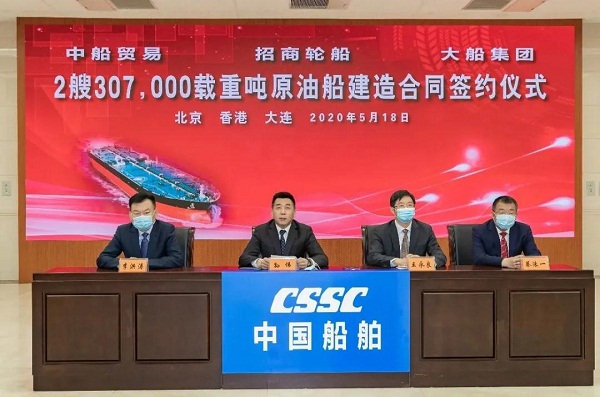 ????5月18日,中國船舶集團旗下大船集團、中船貿易與招商局集團旗下招商輪船在北京、大連、香港三地以“云簽約”方式簽署2艘30.7萬載重噸原油船建造合同。中國船舶集團副總經理孫偉、招商局集團副總經理王宏、招商輪船董事長謝春林出席簽約儀式,中船貿易董事長李洪濤、大船集團總經理楊志忠、招商輪船總經理王永新代表各方在建造合同上簽字。