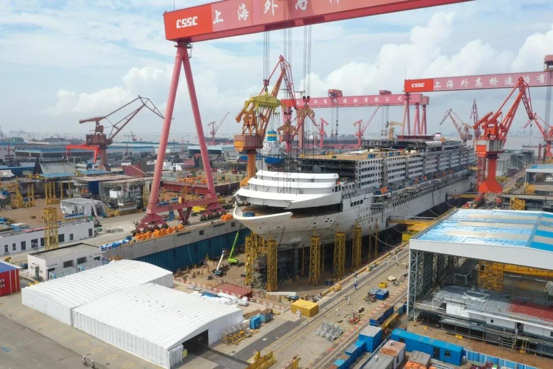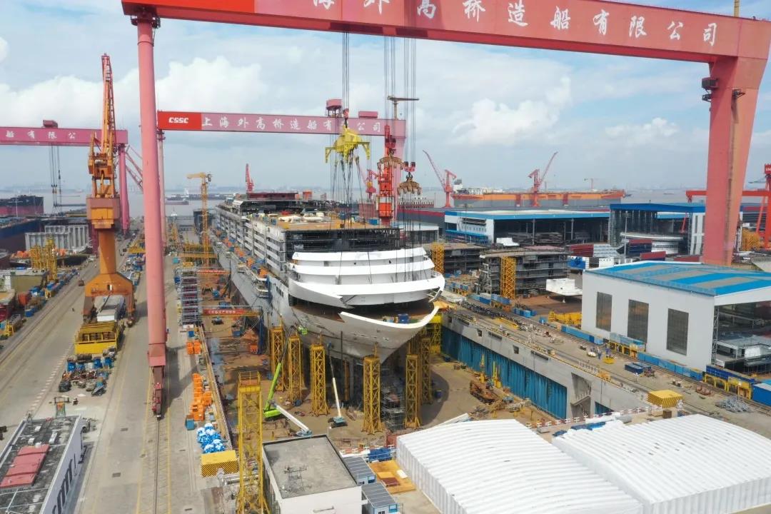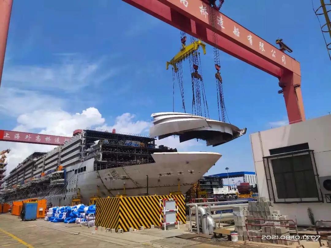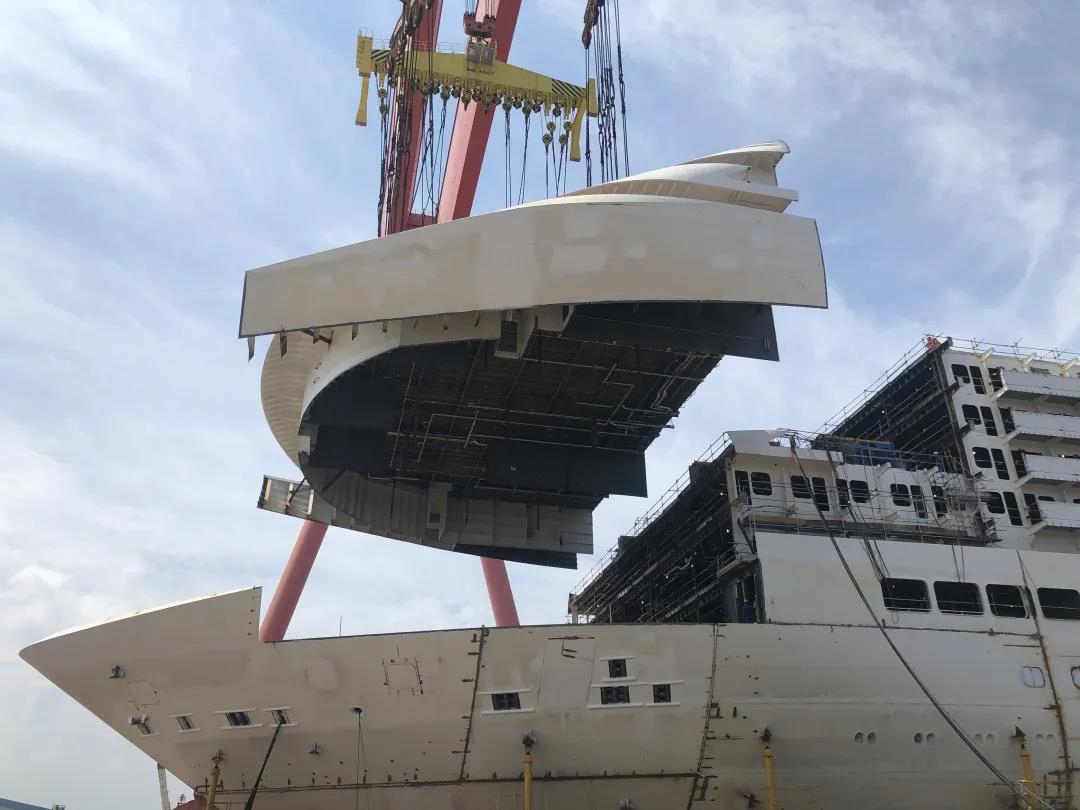 國產(chǎn)首制大型郵輪完成首個艏部總段吊裝! 預計9月實現(xiàn)全船結(jié)構(gòu)貫通。