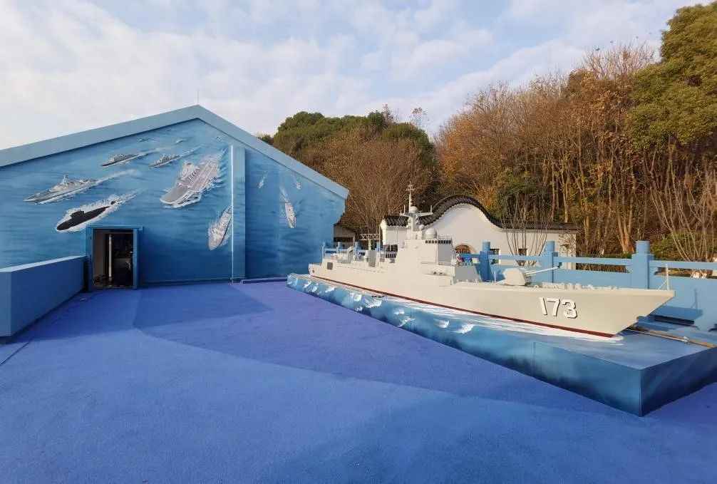 由中國船舶七一四所設(shè)計(jì)施工的艦船打卡地,有著10米長(zhǎng)的大型長(zhǎng)沙艦?zāi)P停剡_(dá)8.75噸的船錨昂首挺立,45艘包括航母、核潛艇、驅(qū)逐艦、護(hù)衛(wèi)艦在內(nèi)的各型艦船武器模型,200多幅圖片文字,為觀眾展示了近代以來海軍裝備波瀾壯闊的發(fā)展歷程。