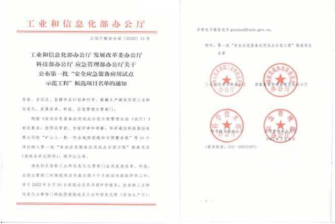 近日,工業(yè)和信息化部辦公廳、發(fā)展和改革委員會辦公廳、科學(xué)技術(shù)部辦公廳、應(yīng)急管理部辦公廳聯(lián)合公布首批“安全應(yīng)急裝備應(yīng)用試點示范工程”候選項目。