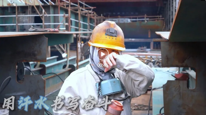 江南造船——制造三部總組作業(yè)區(qū)電焊三組劉士里在酷熱天氣下“全副武裝”焊接。
