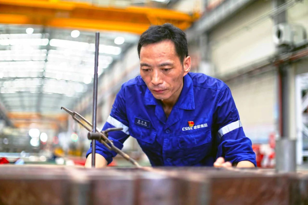 武昌造船——機電事業(yè)部劃線鉗工翁方成顧不上滿臉的汗水,全神貫注為水工閘門結構部件劃上機械加工參考線。