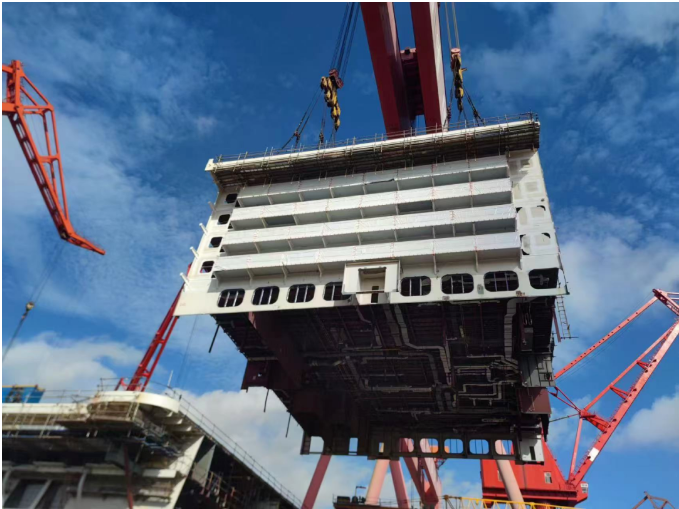 此次完成搭載的U2總段以乘客住艙區(qū)域?yàn)橹?,跨度為五層甲板,是郵輪搭載的首個(gè)帶陽(yáng)臺(tái)的總段,其順利搭載是總段完整性建造速度提升和船塢快速搭載的集中體現(xiàn)。