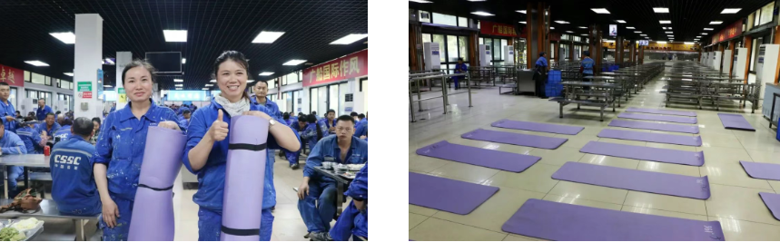 中午時分,走進廣船國際生產(chǎn)指揮樓食堂,十幾臺空調(diào)已經(jīng)提前開啟,食堂內(nèi)涼爽舒適。據(jù)介紹,該公司已經(jīng)將會議室、食堂等公共區(qū)域開放給一線員工作為午間的“休憩港灣”,讓一線員工得以安心小憩、恢復(fù)體力。13個食堂內(nèi),除了不銹鋼凳子、桌子可以供員工躺下休息之外,還為員工準備了瑜伽墊。