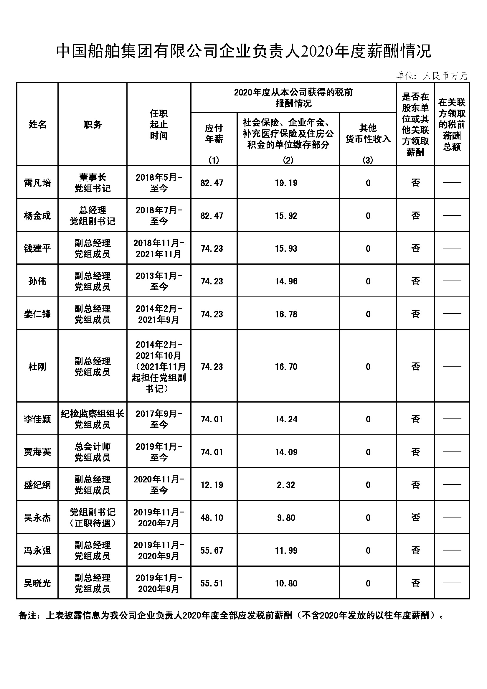 中國船舶集團有限公司企業(yè)負責人2020年度薪酬情況