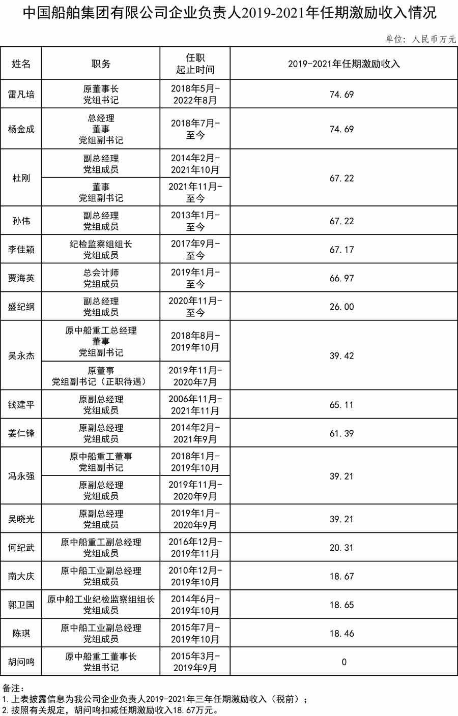 中國船舶集團(tuán)有限公司企業(yè)負(fù)責(zé)人2019-2021年任期激勵(lì)收入情況
