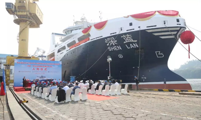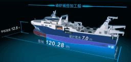 ????“深藍號”由黃埔文沖建造,七〇八所參與設計,總長約120米,型寬21.6米,設計吃水7.3米,設計航速15節(jié),主機功率8000 千瓦,載重噸約5000噸?!吧钏{號”是我國自主研制建造的第一艘漁業(yè)捕撈加工一體船,也是目前最大最先進的漁業(yè)捕撈加工一體船,取得近200項知識產(chǎn)權保護,實現(xiàn)了我國現(xiàn)代化漁業(yè)船舶裝備領域的重大突破,達到世界先進水平;主要用于南大洋漁業(yè)捕撈,兼顧海洋科考功能,可滿足ICE-A冰區(qū)(冰厚度0.8米)及-25℃低溫環(huán)境的營運要求。