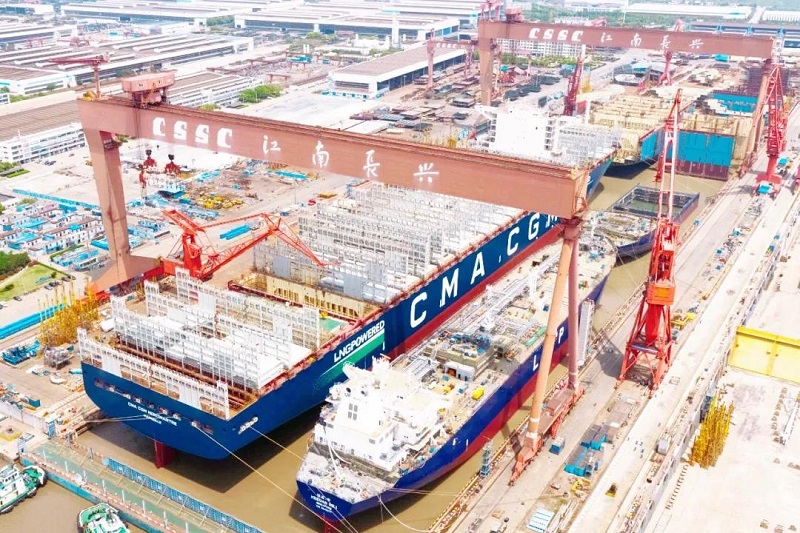 ????眾所周知,船塢是船舶總組搭載的場所,是造船生產(chǎn)的核心資源。江南造船3號(hào)船塢長580米、寬120米,是目前國內(nèi)在用的最大船塢。為提升船塢利用效率,江南造船采取“雙線并造”模式,即一批次液化氣船和一批次超大型集裝箱船同時(shí)建造。此次雙船出塢是江南造船“雙線并造”模式的第五個(gè)批次,也是今年3號(hào)塢出塢的第二個(gè)批次。