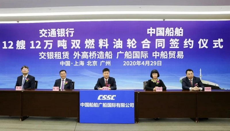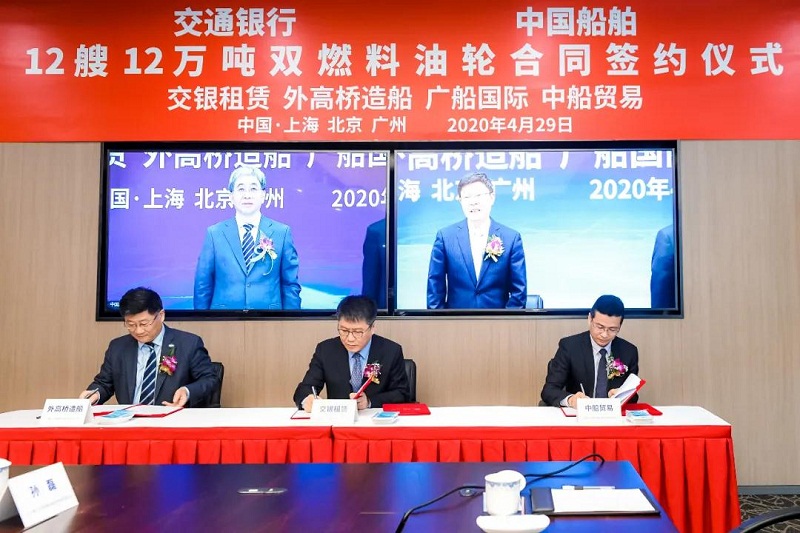 ????4月29日,中國船舶集團有限公司旗下中國船舶工業(yè)貿(mào)易有限公司、上海外高橋造船有限公司、廣船國際有限公司與交通銀行股份有限公司旗下交銀金融租賃有限責(zé)任公司在北京、上海、廣州三地以“云簽約”方式簽署12艘12萬噸雙燃料油船建造合同,合同總金額約46億元人民幣,這是中國船舶集團旗下單位近期承接的又一單筆大額訂單。中國船舶集團黨組書記、董事長雷凡培,交通銀行黨委書記、董事長任德奇,中國船舶集團黨組成員、副總經(jīng)理孫偉,交通銀行黨委委員、副行長呂家進出席簽約儀式。