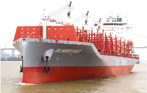 近日,中國船舶集團(tuán)旗下黃埔文沖為美國Del Monte公司建造的600FEU全冷藏集裝箱船首制船“DEL MONTE GOLD”號(hào)交付。該型船總長192米,型寬30米,設(shè)計(jì)吃水9.3米,為國際遠(yuǎn)洋冷藏集裝箱船,全部貨柜箱均為冷藏集裝箱,是一款冷箱量大、裝載靈活、便于維護(hù)的綠色環(huán)保型船舶。