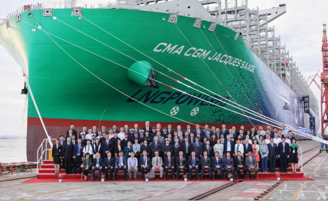 9月22日,由中國船舶集團(tuán)有限公司旗下滬東中華造船(集團(tuán))有限公司和中國船舶工業(yè)貿(mào)易有限公司作為聯(lián)合賣方為世界著名航運(yùn)公司——法國達(dá)飛海運(yùn)集團(tuán)建造的全球首艘23000TEU雙燃料動(dòng)力集裝箱船“達(dá)飛雅克?薩德”號(hào),在上海長興島造船基地命名交付。中國船舶集團(tuán)副總經(jīng)理孫偉、達(dá)飛海運(yùn)集團(tuán)董事會(huì)主席魯?shù)婪颉に_德出席儀式并致辭,教母譚雅·薩德為新船命名,法國駐滬總領(lǐng)事紀(jì)博偉應(yīng)邀出席儀式。