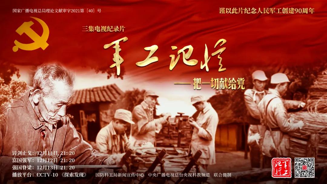 為慶祝中國共產(chǎn)黨成立100周年,紀(jì)念黨領(lǐng)導(dǎo)下的人民軍工創(chuàng)建90周年,由國防科工局指導(dǎo),國防科工局新聞宣傳中心聯(lián)合中央廣播電視總臺社教節(jié)目中心攝制,各軍工集團(tuán)大力支持的3集重大理論文獻(xiàn)電視紀(jì)錄片《軍工記憶——把一切獻(xiàn)給黨》,將于12月11日21:20在央視科教頻道(CCTV-10)《探索發(fā)現(xiàn)》欄目首播,連續(xù)播出3天。該紀(jì)錄片旨在向建黨百年獻(xiàn)禮,向人民軍工90周年致敬,向全社會弘揚(yáng)軍工精神傳遞軍工文化,激勵國防科技工業(yè)戰(zhàn)線廣大干部職工不忘初心、接續(xù)奮斗,為實現(xiàn)強(qiáng)軍強(qiáng)國夢想貢獻(xiàn)力量。