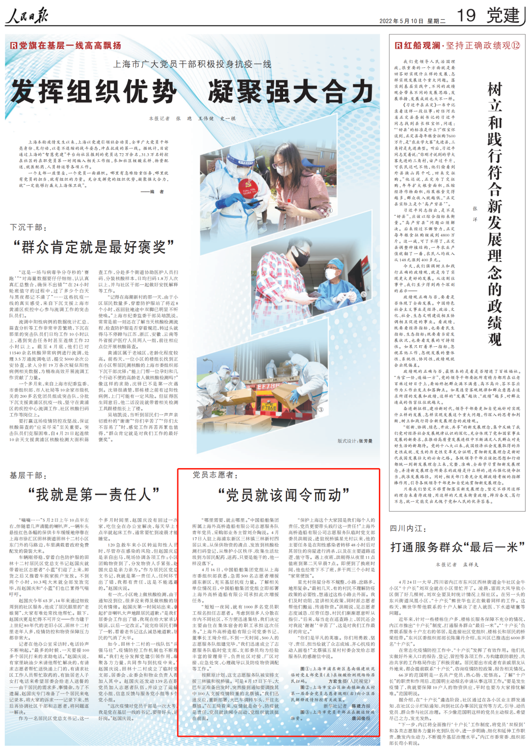 一個(gè)支部一座堡壘,一個(gè)黨員一面旗幟。哪里有急難險(xiǎn)重任務(wù),哪里就有黨員的擔(dān)當(dāng)、就有組織的力量。充分發(fā)揮黨的組織優(yōu)勢(shì),凝聚強(qiáng)大合力,就“一定能夠打贏大上海保衛(wèi)戰(zhàn)”。