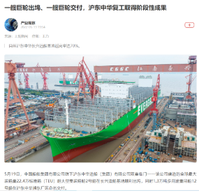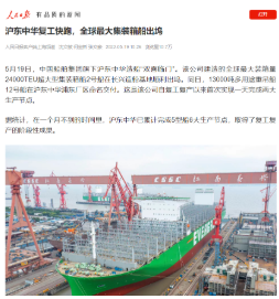 5月19日,中國(guó)船舶集團(tuán)旗下滬東中華雙喜臨門。其建造的全球最大裝箱量24000TEU超大型集裝箱船2號(hào)船在長(zhǎng)興造船基地順利出塢;建造的13000噸多用途重吊船12號(hào)船在浦東廠區(qū)命名交付,標(biāo)志著該項(xiàng)目圓滿收官。這是滬東中華自復(fù)工復(fù)產(chǎn)以來(lái)首次實(shí)現(xiàn)一天完成兩大生產(chǎn)節(jié)點(diǎn)。