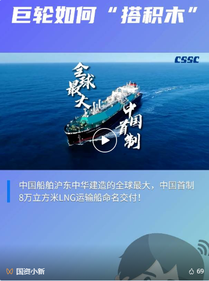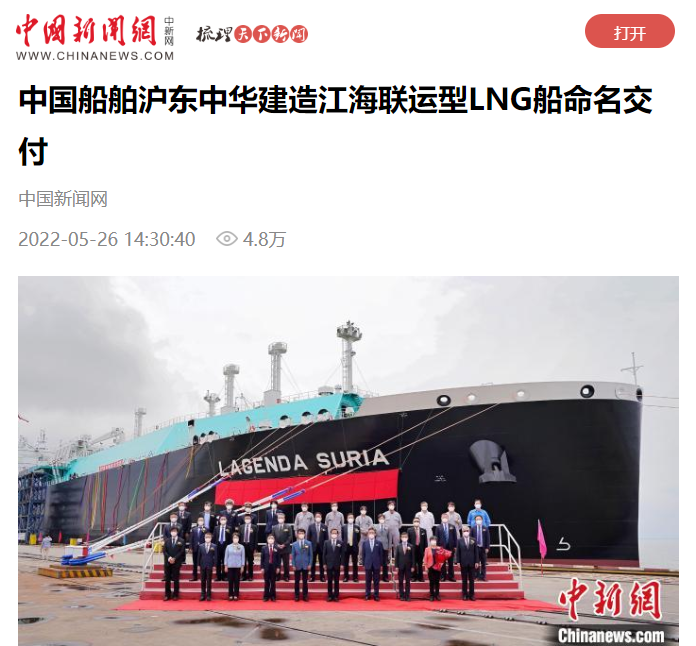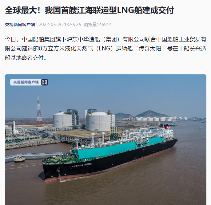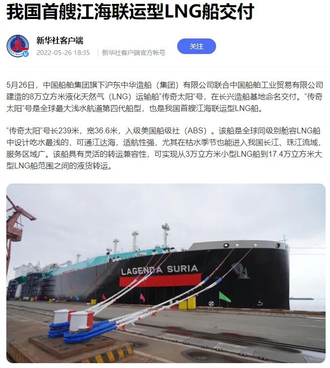 5月26日,中國船舶集團旗下滬東中華聯(lián)合中船貿(mào)易建造的8萬立方米液化天然氣(LNG)運輸船“傳奇太陽”號在長興造船基地命名交付?!皞髌嫣枴碧柺侨蜃畲鬁\水航道第四代、我國首款首制首艘江海聯(lián)運型LNG船,填補了中國淺水航道LNG船的空白,在該細分市場占有率最高,有望成為中國船舶制造的又一精品船型。