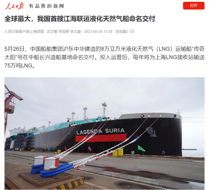 “傳奇太陽”號是滬東中華自4月25日復(fù)工復(fù)產(chǎn)以來交付的第二艘船,投入運營后,每年將為上海LNG接收站輸送75萬噸LNG。另悉,2號船計劃于下個月交付,屆時“姊妹船”聯(lián)袂為上海社會經(jīng)濟發(fā)展、清潔能源保供和綠色產(chǎn)業(yè)振興將發(fā)揮重要作用。