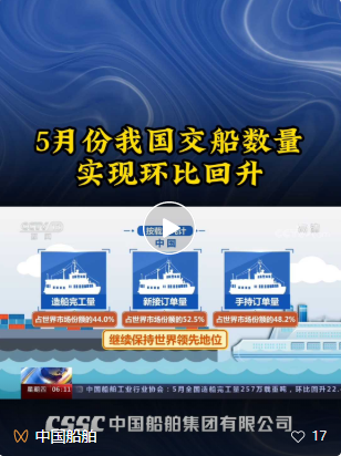 據(jù)統(tǒng)計(jì),截至五月底,中國船舶集團(tuán)交付新船82艘、598萬載重噸,分別完成年度計(jì)劃的42%和43%,為完成全年目標(biāo)任務(wù)奠定了良好基礎(chǔ)。