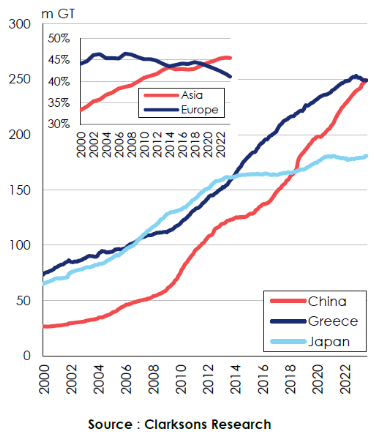 截至8月12日,我國(guó)船東所持有的船隊(duì)規(guī)模已經(jīng)達(dá)到2.492億總噸,市場(chǎng)份額占比為15.9%(中國(guó)船東的船隊(duì)價(jià)值約為1800億美元),略高于希臘船東的2.490億總噸,市場(chǎng)份額占比15.8%(希臘船東的船隊(duì)價(jià)值約為1630億美元)。
