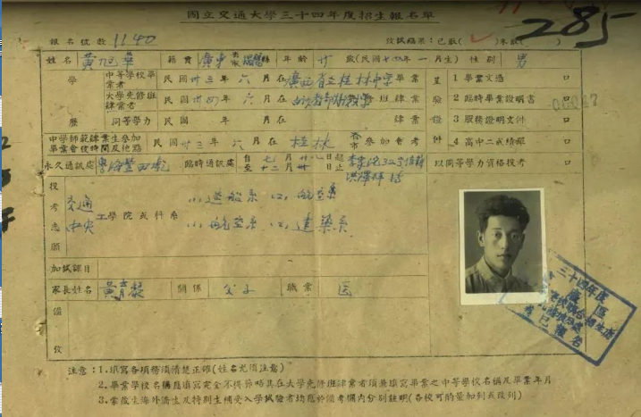 “國(guó)立交通大學(xué)”這所當(dāng)時(shí)在科學(xué)技術(shù)領(lǐng)域全國(guó)首屈一指的學(xué)術(shù)殿堂,在黃旭華心中是神圣而遙遠(yuǎn)的。以至于當(dāng)真正有機(jī)會(huì)填寫被保送大學(xué)的名字時(shí),他竟然沒有勇氣填上“國(guó)立交通大學(xué)”的名字,只填上了一個(gè)中央大學(xué)的航空系。